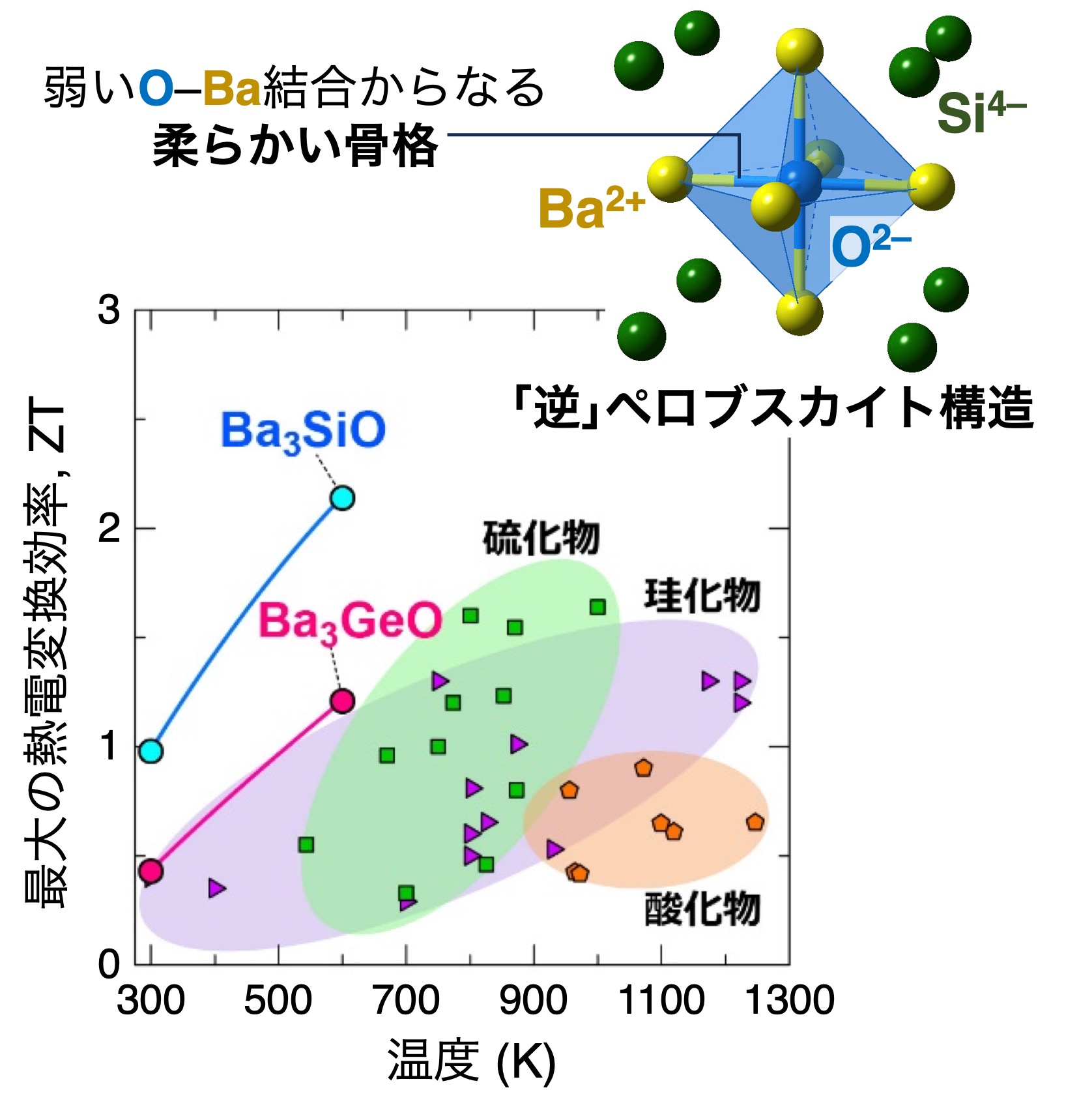 当研究室では、最先端の計算科学と実験を通じて、熱を運ぶ電子とフォノンを巧みに操る材料設計を構築し、環境調和元素からなる高性能熱電材料の開発に挑戦しています。例えば、SrTiO3の多結晶体に水素を添加することで、高性能熱電材料に必要な低い熱伝導率と高い電気出力を両立させ、熱電変換効率を向上させることに成功しました。また、逆ペロブスカイト構造と呼ばれる特殊な結晶構造を持つBa3SiOが、約300°C付近において、毒性元素を一切含まない材料としては最高レベルの熱電変換効率を示す可能性を持つことを見出しています。こうした新材料の開発をさらに深化させ、発電モジュール化を視野に入れた研究を推進します。